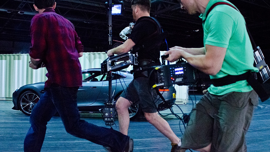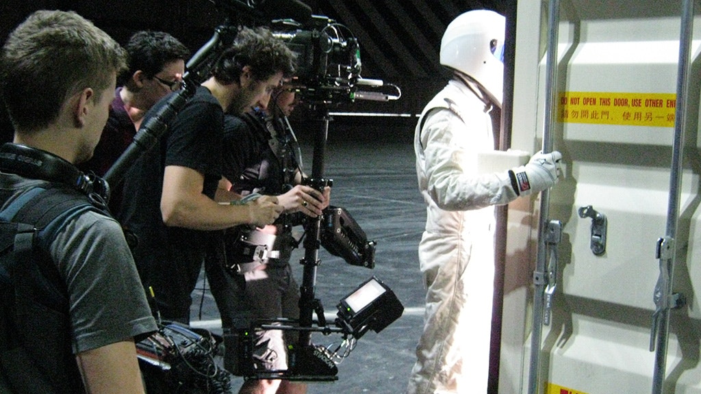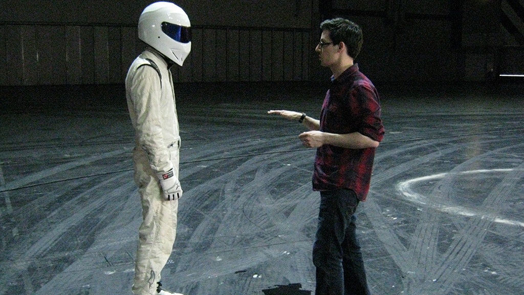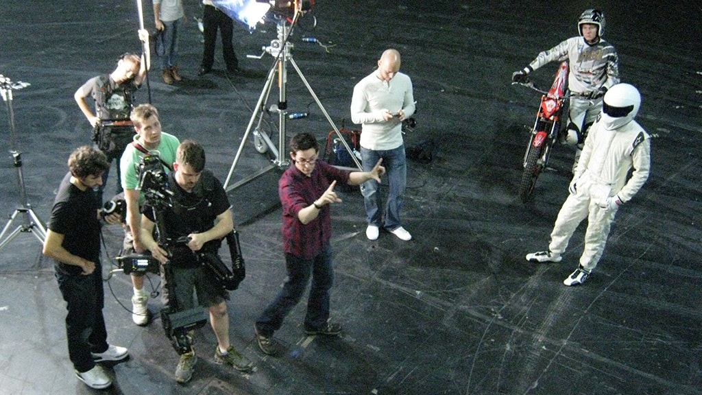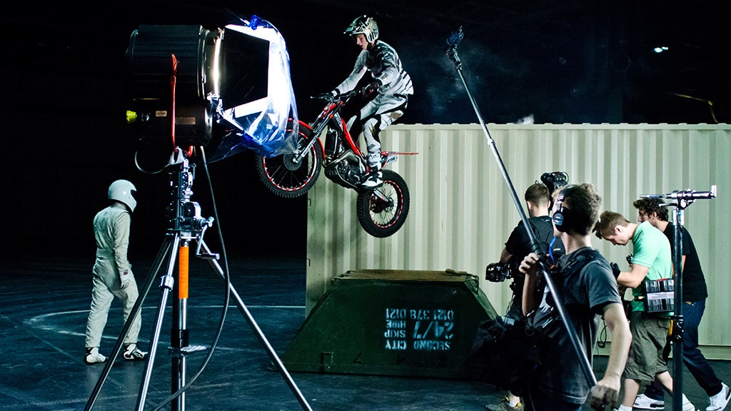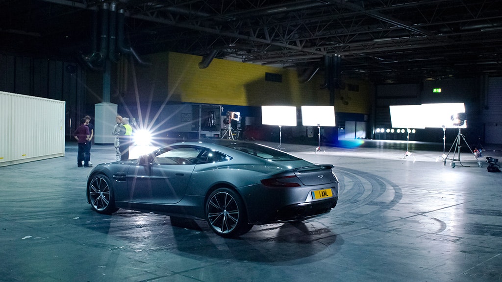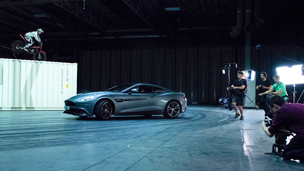 This time we got the Stig to power slide an Aston Martin Vanquish around the Excel centre, whilst a stunt rider jumped off shipping containers with his motorbike.